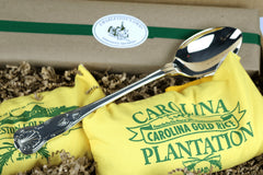 Gold Rice and Silver Spoon; a unique gift of historic Carolina rice. Includes a bag of heirloom Carolina Gold Rice and aromatic Charleston Gold Rice along with a gift wrapped Silver plated Charleston Rice Serving Spoon.