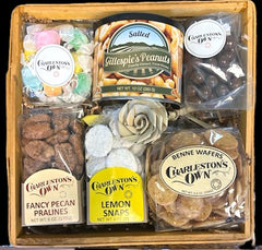Our Sweet 'n Salty basket is filled with an assortment of Charleston's own delicious treats along with a 10 oz can of Gillespie's Salted Peanuts all wrapped up in a square grass basket. Basket contains: 4oz assorted Salt Water Taffy, 6oz Fancy Pralines, 4oz lemon Snaps, 5.5oz Benne Wafers, 3oz Milk Chocolate Pretzel Balls, 10oz Gillespie's Salted Peanuts and an authentic Sweetgrass Palmetto rose.