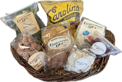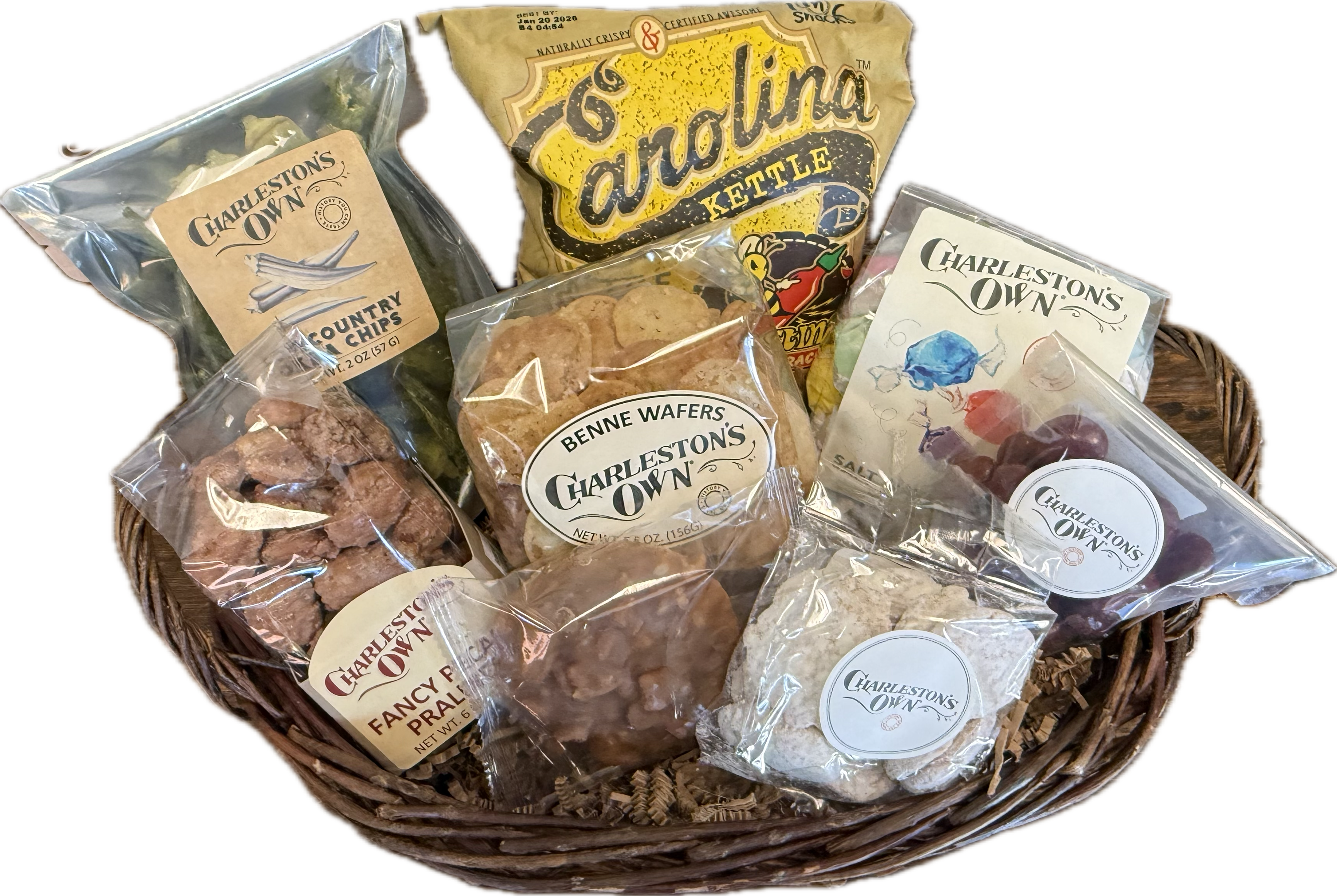 A gift basket filled with assorted, ready to eat snack items from Charleston. Items include Charleston's Own Benne Wafers, Salt Water Taffy, Dried Okra Chips, Key Lime cookies, Pecan praline halves, Carolina Kettle Potato Chips, a Southern Pecan Praline, and Red Velvet Chocolate Cherries.