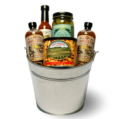 The Charleston Bloody Mary Bucket. A favorite gift basket showcasing local South Carolina products. Includes two (2) mini 8 oz bottles of Charleston Bloody Mary Bold & Spicy Mix, a jar of Miss Ezzie's Hot Pickled Okra (because a Bloody Mary is not a Bloody Mary in the South without pickled Okra) along with a bottle of Charleston's Own Marsh Fire Hot Sauce. We also include a 10 z can of South Carolina grown Peanuts from Gillespie's for snacking. The items are presented in a galvanized metal bucket. We shrink wrap the gift bucket for travel or shipping. Just add vodka, fresh lime wedges, a couple of glasses and it's a party!