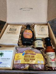 Our Breakfast Gift Box is assembled from some of the best items that we could find. Perfect for a family holiday breakfast or brunch gathering and serves 4-8 people. We have included Broadbent's Smoked Country Ham from Kentucky, Charleston's Own Pancake Mix, Anderson's Real Maple Syrup from Wisconsin, Charleston's Own Stoneground Yellow Grits, 8 ounces of locally roasted ground coffee from Charleston Coffee Exchange (Coffee flavor is subject to vary, depending on the availability), Lowcountry Hot Sauce from Charleston's Own along with a jar of our world famous Peach Butter OR Peach Preserve. (The jam is subject to change depending on the availability).